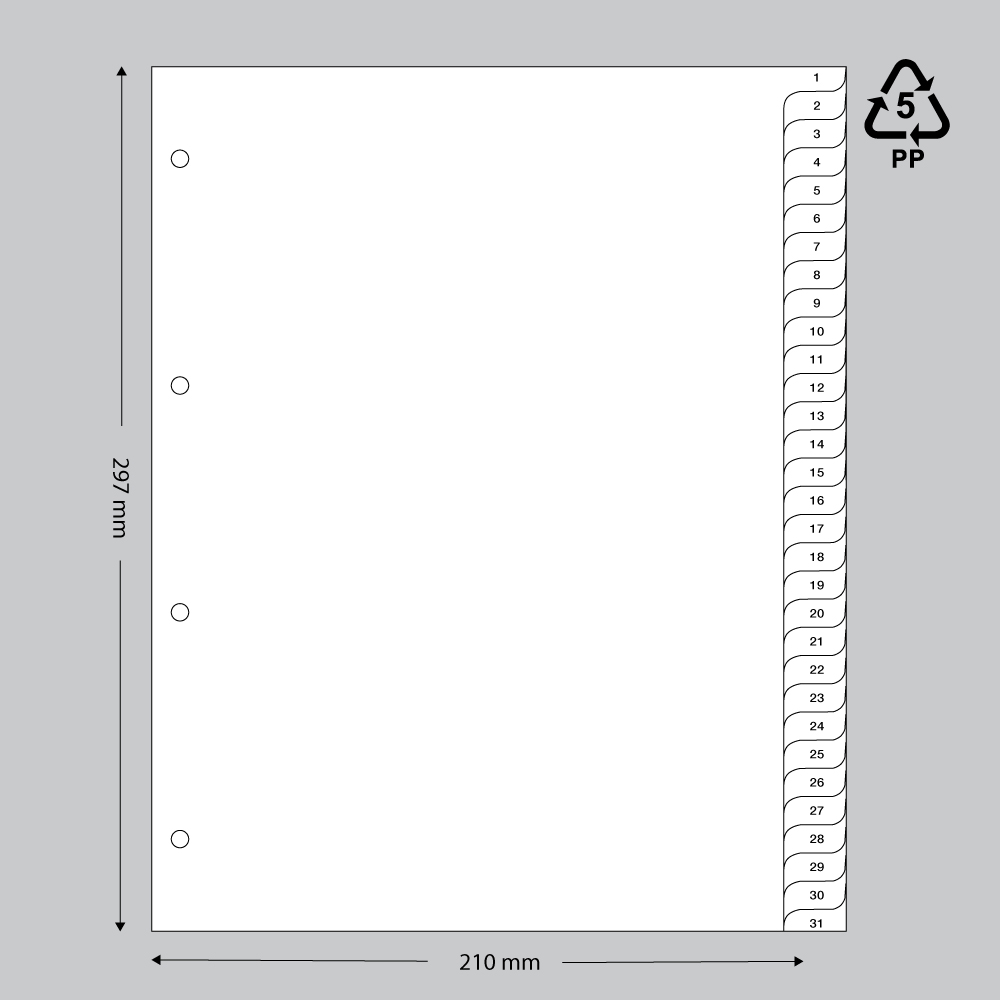 Deze set bestaat uit 10 witte tabbladen, genummerd van 1 t/m 31, en is geschikt voor A4-formaat.