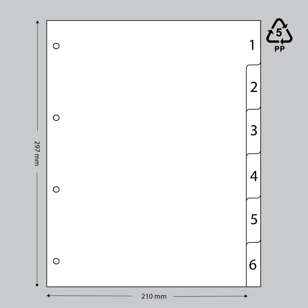 Deze set bestaat uit 10 witte tabbladen, genummerd van 1 t/m 6, en is geschikt voor A4-formaat.